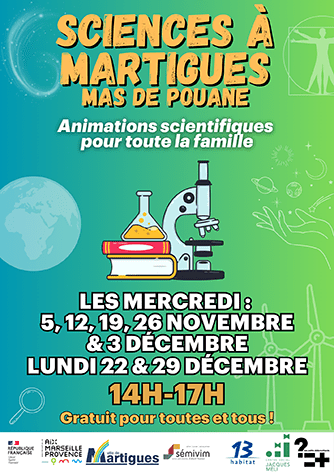 La Science en bas de chez toi, animations et expériences sur les secrets de l’air, en pied d’immeuble dans le quartier Mas de Pouane de Martigues, les 22 et 29 décembre de 14h à 17h, sur l’invisible à Notre-Dame des Marins le 29 décembre, sur le monde des extrêmes aux 4 vents le 30 décembre et sur l’hiver et le froid à Boudème le 30 décembre.